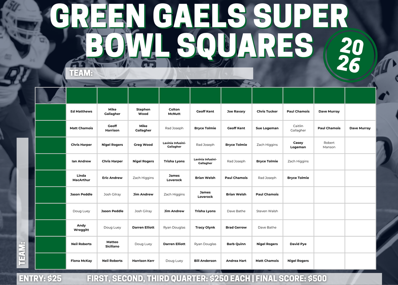 The Green Gaels are excited to launch our Super Bowl LX Squares Fundraiser, a fun and easy way to support the club while adding some extra excitement to Super Bowl Sunday.